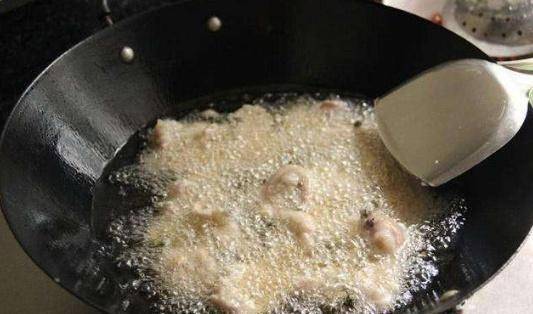 第四步:肉醃好後,放入面粉漿中,讓肉均勻的裹上面粉。把它放在鍋上,等鍋熱瞭,然後倒入油。油大約80%熱的時候,就可以把肉放進鍋裡炸瞭。煎的時候一次加一個,防止脆肉粘連。當肉煮到變成棕色時,就可以瞭。