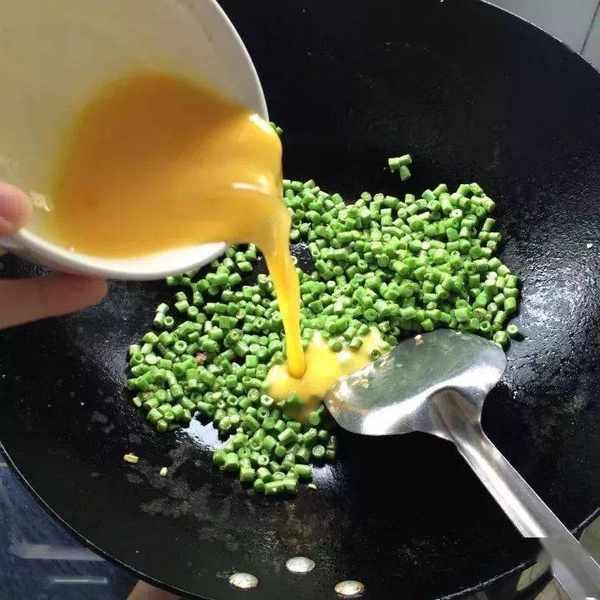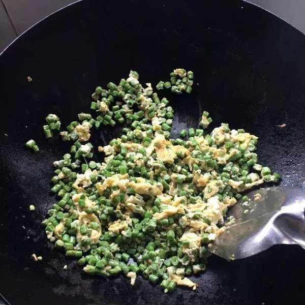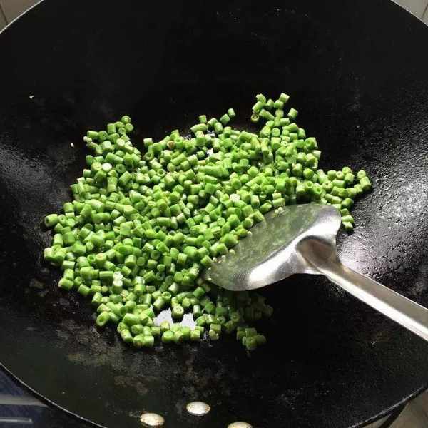 翻炒至凝固,這時雞蛋會自己裹在豆角粒上,註意把大塊的豆角撥散。