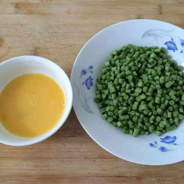1、豆角掐頭洗凈,切成半厘米左右的小粒,切的越小越好,雞蛋打散。