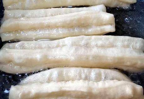 3、炸油條的時候,油的溫度要控制好。鍋內放油,50%左右的熱度,全程小火煎。不要心急用大火,否則蛋糕很容易炸黑。