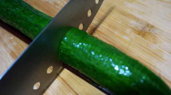 2、切好以後把黃瓜翻到另外一面,然後菜刀打斜,接著給黃瓜切片,切到筷子處停止就可以,切的時候要捏緊筷子,防止筷子滾刀。