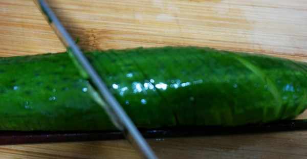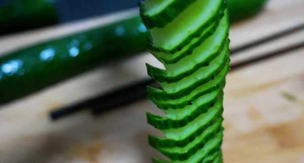 1、把黃瓜清洗幹凈,然後拿出兩根筷子,墊在黃瓜下面,菜刀垂直切下去,然後切到筷子處停止,把黃瓜均勻的切好,如圖所示,購買黃瓜的時候盡量選擇粗直的黃瓜,比較好做造型。