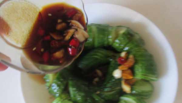 5、調料倒進去以後,這道美味的蓑衣黃瓜就做好瞭,是不是非常好看呢,經常吃拍黃瓜也會覺得膩,不如換換這道美麗又好吃的蓑衣黃瓜,拿來招待朋友也是一道不錯的菜哦,清脆爽口,顏值還高,是誰看瞭都會贊不絕口的手藝,快來一起學習一下這道菜吧。
