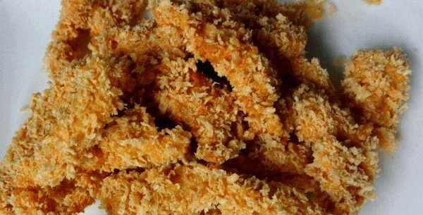 5、盤子裡放適量面包屑,然後用面包屑裹上雞蛋液。一切就緒後,我們就可以開始炒瞭。6、鍋裡放足油,先開大火加熱到50%到60%熱,然後把雞塊一個個放進鍋裡,調小火。炸,不要用大火,不然會粘。慢慢加熱,使雞柳內部變成褐色。當你第一次穿上它們時,不要急於混合它們。當它們變硬時,將它們混合並全部油炸。煎至一切呈金黃色。做好的雞肉味道很好,外面的味道也不錯,以後不用再買瞭。