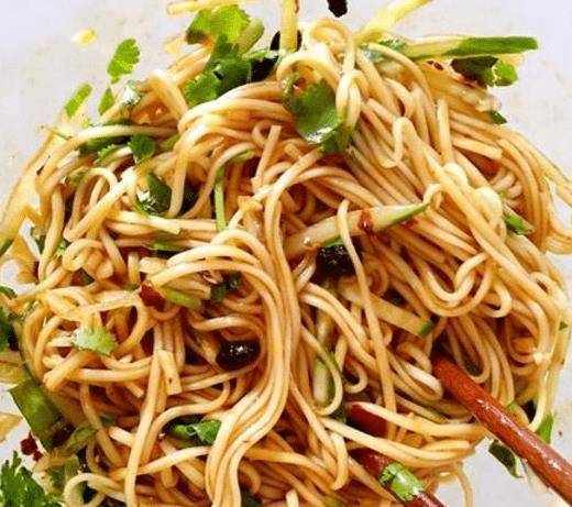 熱油澆在面條上,可以帶出其他食材的香味,更香。最後將面拌勻,撒上一些香菜調味。這樣做的涼面簡單方便,味道也很鮮美。夏天吃這些冷面也很爽口。