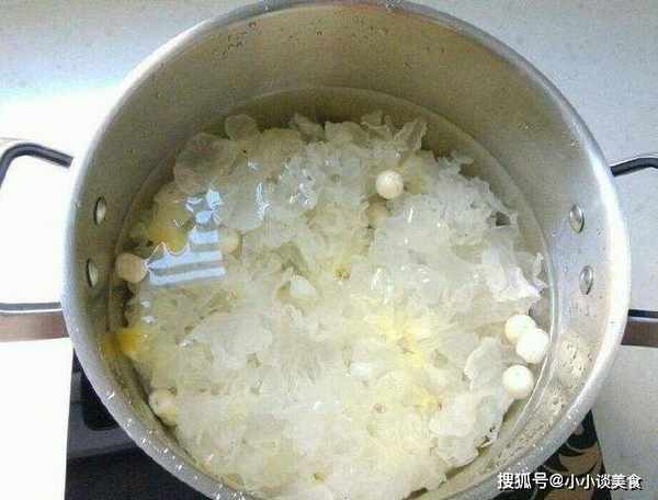 將泡發好的白蘑菇放入鍋中,然後蓋上足量的清水。如果註入的水量是銀耳的兩倍,水量不宜過多或過少。避免中途再次加水。中間加水會導致表殼無膠。