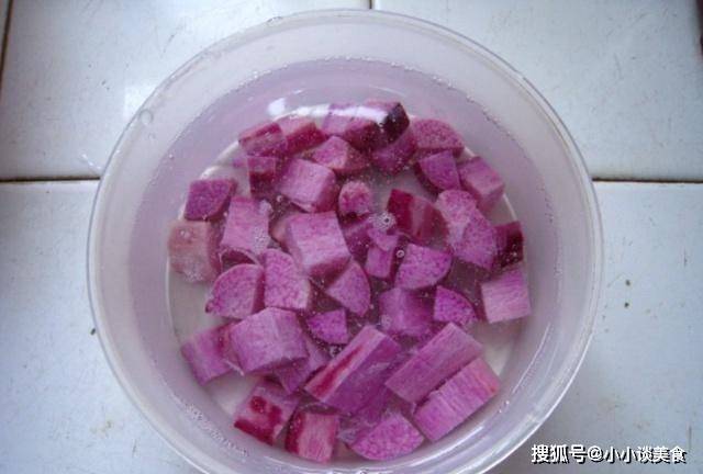 第一步:再次清理紫薯土。將泥土全部清洗幹凈後,用清水沖洗數次,然後將表皮全部剝掉。剝紫薯皮的時候要小心,不要弄到手上,以免沾到手上。癢的情況。紫薯去皮後用清水洗凈,切塊。將切好的紫薯放入碗中,倒入少許水浸泡紫薯,以免氧化。