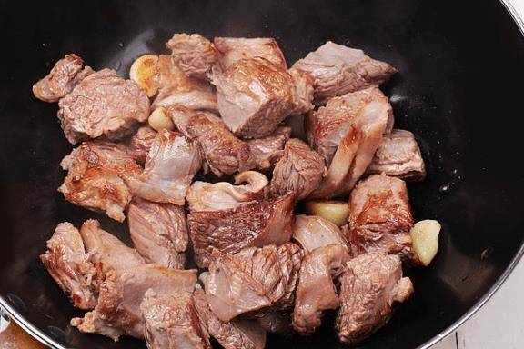買來的牛排骨切成大方塊,用清水浸泡30分鐘,鍋中水燒開,牛肉焯水,撈出裝盤。鍋裡放油,下牛肉翻炒。炒好後加入開水。這個時候不要加冷水。沸水使牛肉蛋白質凝固,並保留瞭肉的鮮味。水要加足,中途加水湯會不濃。