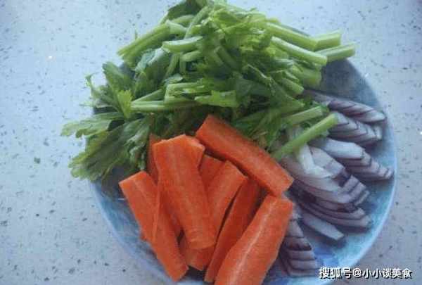第二步:雞胸肉處理好後,將洋蔥去皮洗凈。洗凈後,將洋蔥對半切開,切成長條備用。然後將準備好的胡蘿卜沖洗幹凈,用刀清洗幹凈。切1/3,胡蘿卜去皮,也切成長條。最後用清水將買回來的青菜沖洗幹凈,洗去芹菜雜質。芹菜洗凈後,切成長條。