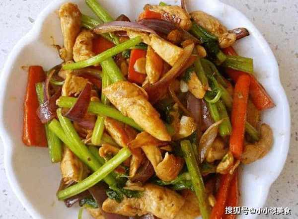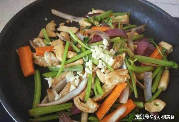 第四步:待胡蘿卜煮軟後,加入芹菜和洋蔥,味道會更好。芹菜和洋蔥炒好後,加入炸好的雞肉翻炒均勻,再加入適量的鹽、蒜末和蠔油調味,更入味。最後翻炒均勻,加入適量料酒稍煮。