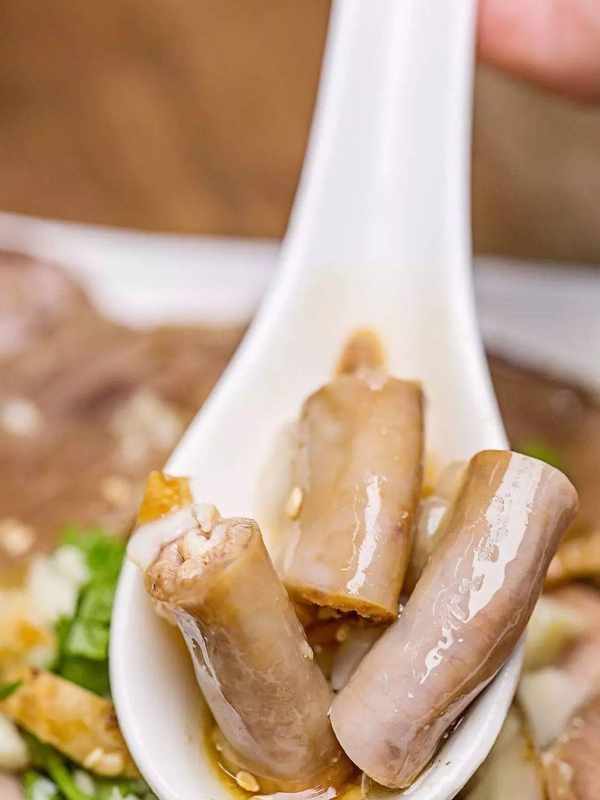牛粉腸的脂肪含量比較多,所以吃起來比較香。但牛粉腸卻並不像豬大腸那樣香而油膩,它吃起來是香而不膩的。