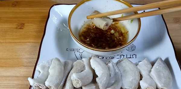 白灼的粉腸蘸著調好的醬汁吃,脆爽,粉糯,甘香,越嚼越香,好吃到停不下來。