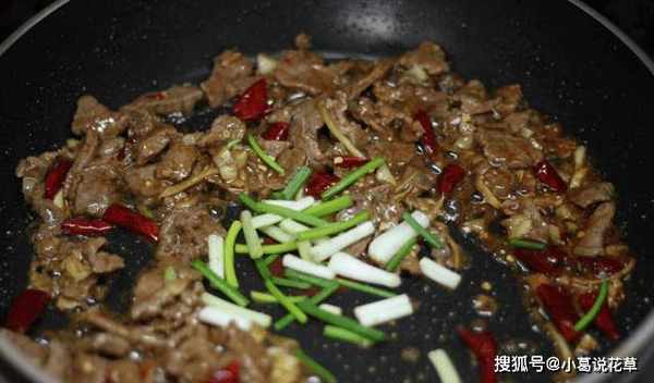 第四步:將醃制好的牛肉放入鍋中快速翻炒。待牛肉炒至稍微變色時,加入切碎的幹辣椒。加入幹辣椒翻炒均勻,不斷攪拌。拌勻後加入白酒去腥,再加入醬油和鹽調味。加入所有調料後,快速炒勻,繼續炒至牛肉完全變色,然後加入一些洋蔥。