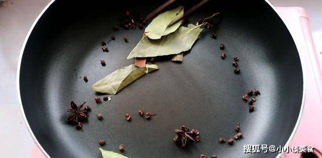 3、鍋中放入八角、桂皮、五香粉和胡椒粉,開小火炒1-2分鐘。