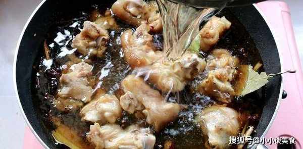 6.炒至豬腿撒上鹽,加入八角、桂皮、月桂葉和胡椒粉。倒入足量的開水,沒過豬腳,大火燒開。