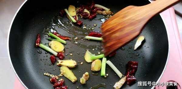 4.鍋中倒入食用油,放入蔥、薑、幹辣椒炒出香味。