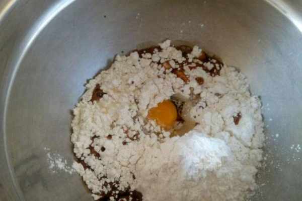 步驟4盆裡放160克面粉、一個60克左右的雞蛋,紅棗碎,然後倒入紅糖酵母水混合。