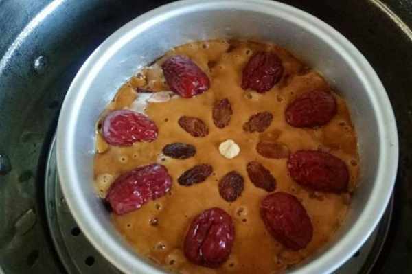 步驟8發酵好的面糊明顯膨脹,加入紅棗做裝飾,還可以裝飾些葡萄幹或者幹果。大火蒸20分鐘後關火,燜3分鐘後揭鍋蓋。