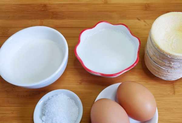 1、首先來準備下做這款【葡式蛋撻】所需要的食材:加工成半成品的大蛋撻皮9個,有瞭現成的蛋撻皮在傢裡制作起蛋撻來也很方便,市面上有大小兩種,您可以根據自己的喜好選擇;2個雞蛋、80克純牛奶和100克淡奶油調成蛋撻液,再加上20克白糖增加甜味,幾滴香草精去除蛋腥味。