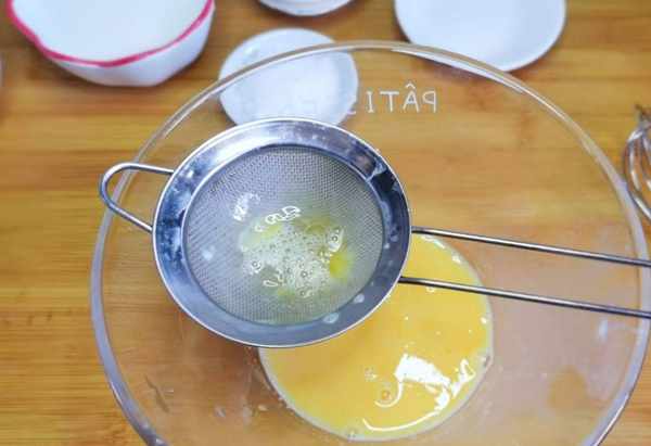 2、先來分2步調蛋撻液:2個雞蛋用流水清洗幹凈外殼,分別磕入碗中攪打均勻,一般葡式蛋撻為瞭口感更佳隻選用蛋黃,因為自己傢裡制作就不那麼講究瞭,就將蛋清蛋黃全部用上瞭;徹底攪打均勻後,再用濾網過濾一遍,把沒打勻的蛋清過濾出來,口感會更細膩。