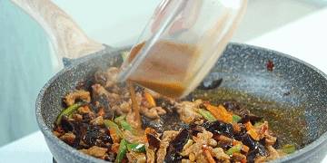 8.將料汁倒入鍋中,大火燒開後翻炒均勻,關火後即可裝盤。