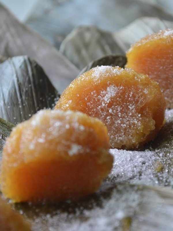 6、包好的粽子用電飯煲煮兩個小時,煮好之後要浸泡到冷卻才能撈出來,這樣做出來的堿水粽味道更香。剝開粽葉,蘸著白砂糖和蜂蜜吃,特別好吃。
