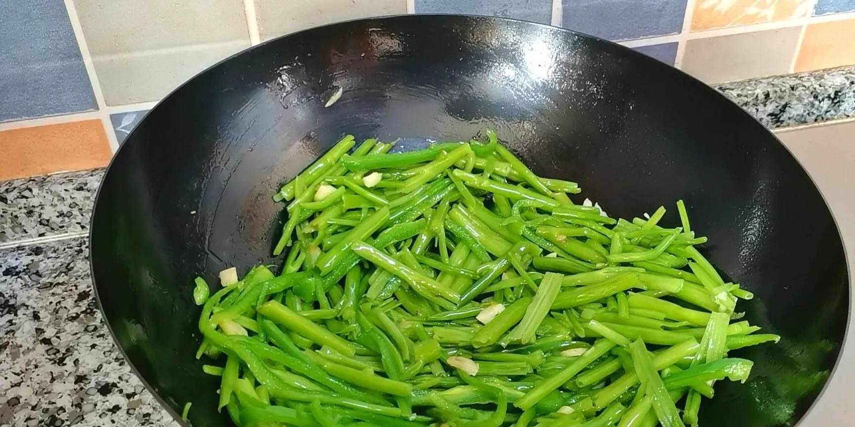 2,將空心菜桿捏碎,掐成小段。