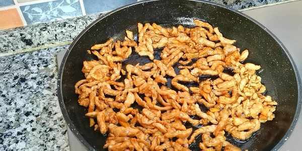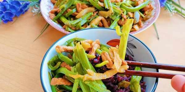 8,倒入肉絲和榨菜絲,再加適量白糖提鮮,翻炒均勻就可以出鍋瞭。