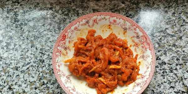 4,洗凈的瘦肉切成肉絲,加適量的薑絲、鹽、生抽、老抽、淀粉,抓拌均勻,再加少許食用油,抓拌均勻,防止粘黏,醃制15分鐘。