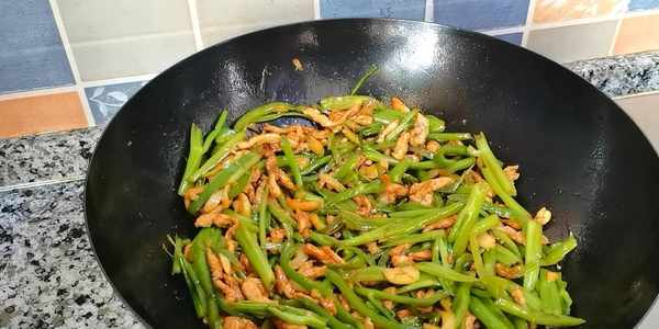 7,鍋中加適量的油,下蒜末,炒出香味兒。倒入空心菜桿和青椒絲炒至斷生,加適量的鹽、生抽翻炒均勻,喜歡吃辣的朋友可以加點小米辣翻炒。