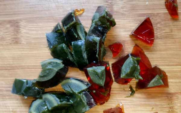 6、把皮蛋放在案板上,用手掌蓋住中間滾動兩下,這樣皮蛋的外殼就碎瞭,可以輕易地剝出來一個完整的皮蛋,剝好的皮蛋用菜刀切成皮蛋丁。