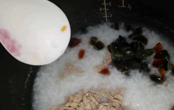 7、煮粥隻差兩分鐘結束時,打開鍋蓋放入皮蛋和瘦肉攪拌均勻。