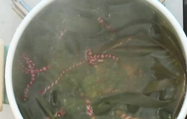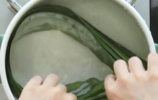 第一步:首先準備一鍋350ml的沸水,把準備好的粽葉放入其中,大火水煮四分鐘撈出控幹。