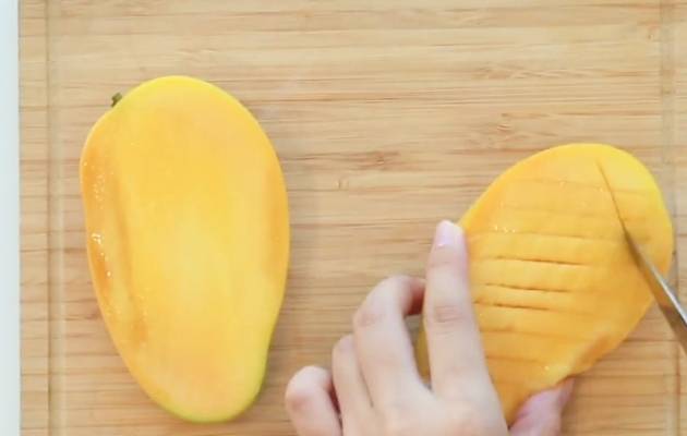 第三步:把芒果對半破開,去掉芒果核和芒果皮,把芒果肉切丁備用。