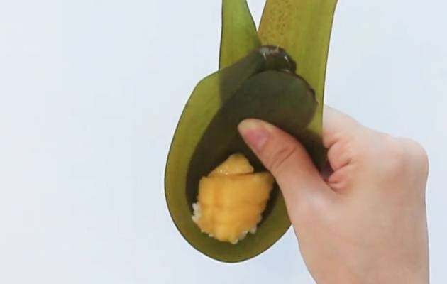 第四步:隨後把粽葉先卷成漏鬥狀,先在底部鋪上一層椰香糯米,而後在中層鋪上芒果丁,之後在最上層鋪上一層糯米,然後按照自己最熟悉的裹粽辦法,整理好粽子備用。