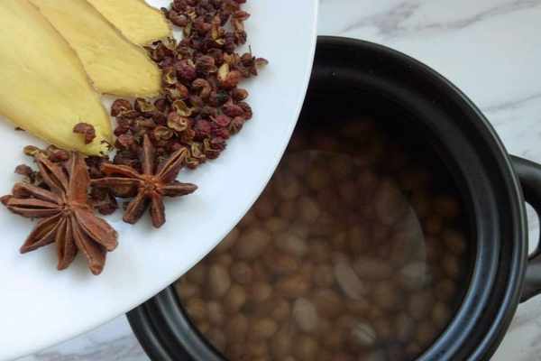 2、砂鍋中加入適量的水,然後放入花生米和薑片以及八角和花椒。