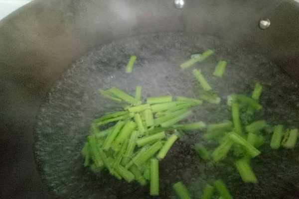 5、鍋中加入適量的水燒開,將切好的芹菜放入水中焯一下,水中加入一點點的食用油,這樣能夠保證芹菜的顏色不變黃,焯好後撈出來瀝幹水分,再將胡蘿卜放入水中焯熟,然後同樣撈出來瀝幹水分和芹菜放在一起。