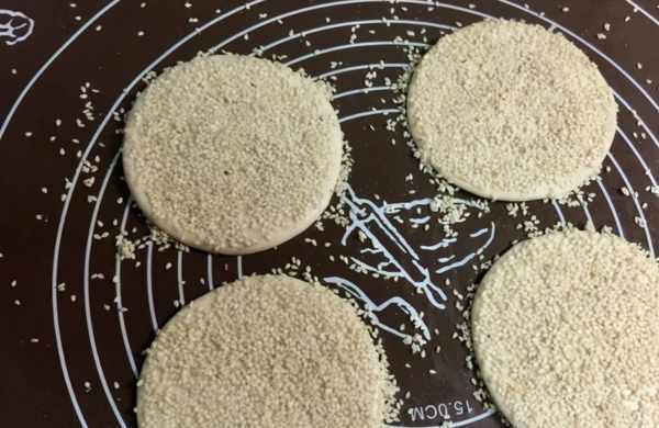 10、然後在小圓餅表面均勻的刷上蜂蜜水。刷好蜂蜜水以後,在小圓餅上均勻的撒上白芝麻,然後放在一邊,讓白芝麻充分地粘在小圓餅上,放個十分鐘左右就行。