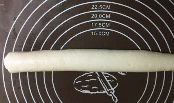 7、然後把面皮從另一端開始,緊緊地卷起來,不要卷入空氣,卷成長條。