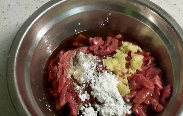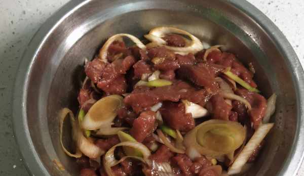 生抽5g,老抽5g,白糖6g,料酒15g,鹽1克,白胡椒粉0.5g,香油10g,玉米淀粉3g,將5g,大蔥1根,牛肉200g,蜂蜜+清水5g+5g,香菜適量。