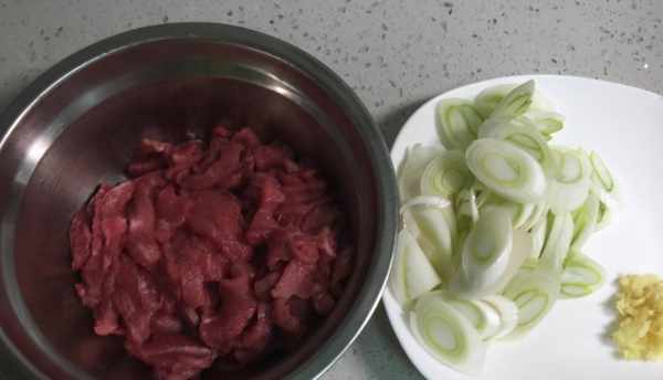 2、趁著醒面的這段時間來醃制一下牛肉,牛肉建議選擇燒烤常用的部分,比如牛上腦,牛肉切成薄片放在小盆裡,大蔥蔥白部分切成片,生薑去皮切成沫。
