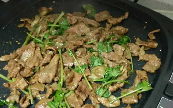 14、加入香菜以後翻炒幾下,把香菜炒熟,就可以關火瞭,然後在燒餅上橫切一刀,把烤好的肉放進去,燒餅夾肉就做好瞭,是不是非常的香,又省事呢,快來學做起來吧。