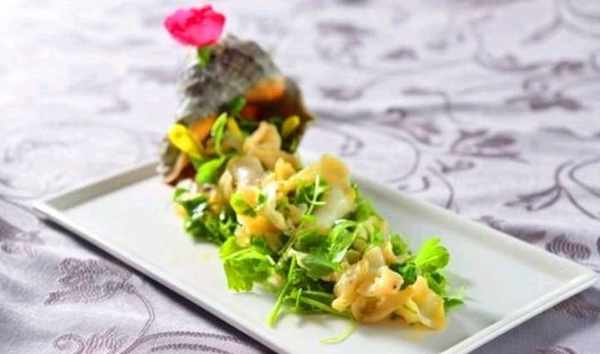 大響螺1個、三葉芹25克、芥末油5克、鹽2克、味精2克、蔥油2克