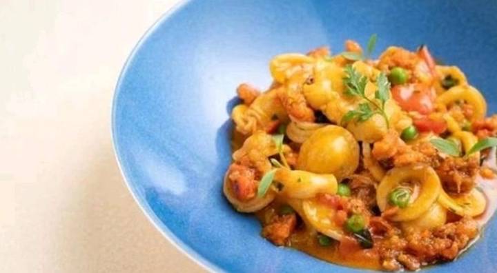 蟹肉30克、貓耳朵面150克、甜豆10克、禿黃油10克、帝王蟹湯30克、帝王蟹油10克、蒜泥4克、西芹末4克、黃油8克、羅勒葉末3克、白蘭地4克、鹽3克、黑胡椒1克