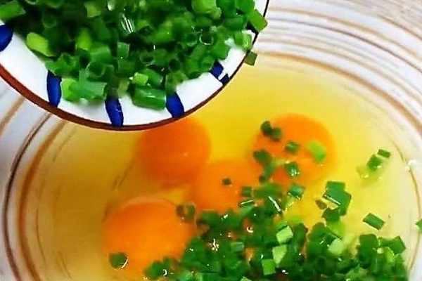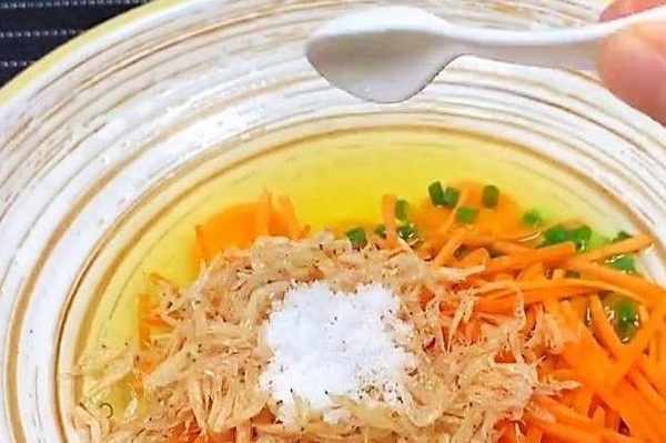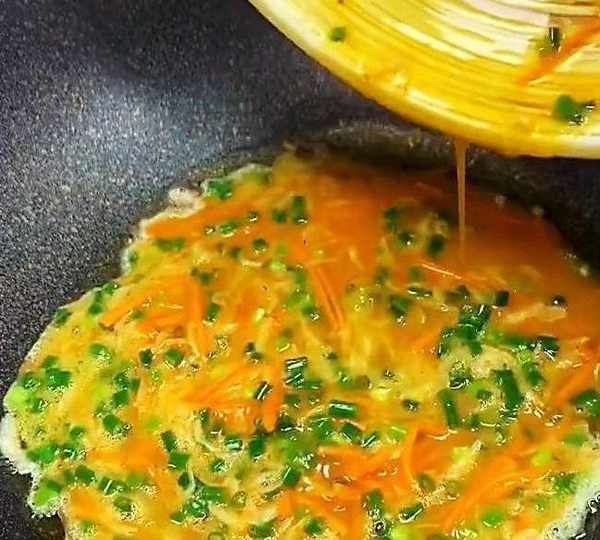打上五個雞蛋,加入蔥花和胡蘿卜絲。