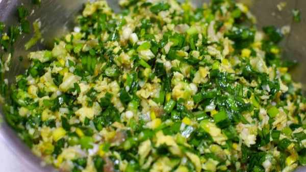 這樣韭菜餡就拌好瞭,喜歡口感豐富一些,可以加一些木耳碎或者豆腐碎進去。