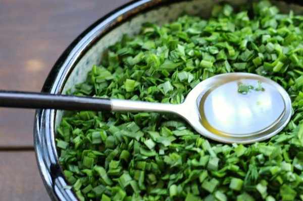 給韭菜中加一些食用油攪拌,最好用那種沒有味道的油,韭菜表面粘上油脂,避免韭菜脫水,先不要加鹽。