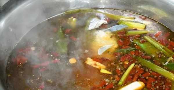 說明:煮魚水是將薑、蔥、花椒、幹辣椒用豬油炒香後,摻入適量清水,燒開加入鹽和少許白酒即可。