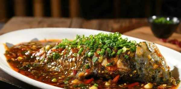 原料:大鯽魚1條(約600克)、藿香碎50克、泡豇豆粒50克、泡蘿卜粒30克、泡薑米30克、薑蒜米70克、泡小米椒末40克、泡椒末30克、豆瓣醬30克、蔥花15克、雞精2克、味精2克、白糖20克、花椒面2克、藤椒油5毫升、香醋15毫升、紅燒醬油5毫升、水淀粉60毫升、豬油30克、菜籽油70毫升、煮魚水適量