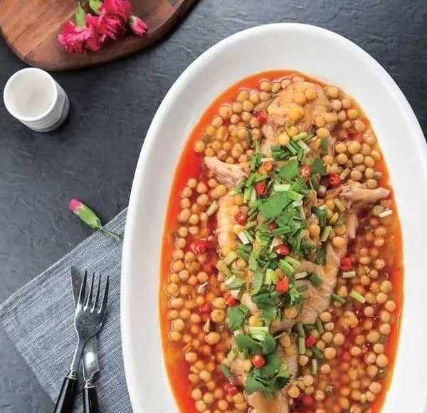 3.泡菜水調味勾好芡,放入壓好的豌豆翻勻,起鍋淋在盤中魚上面,撒上蔥花、香菜即成。